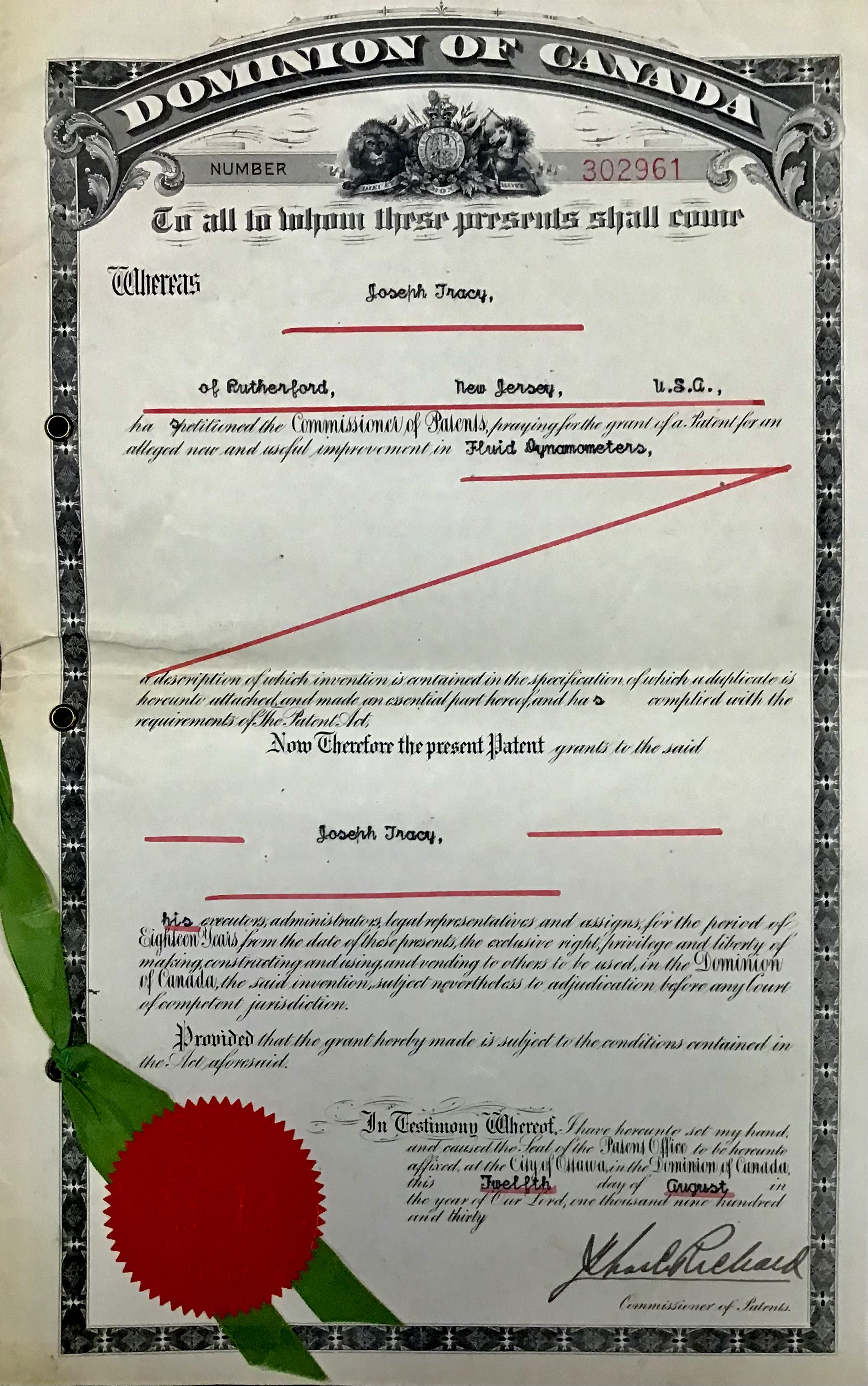 Canadian Patent #302961 Aug. 12th, 1930