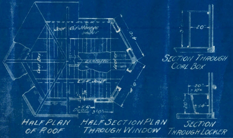 Detail showing coal storage. While not indicated on the plans, coal storage and a chimney leads one to believe there must have been some sourse of heating in these cabins.