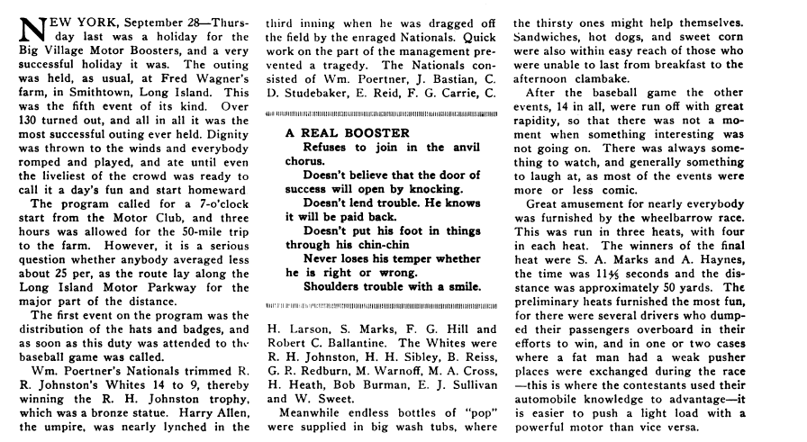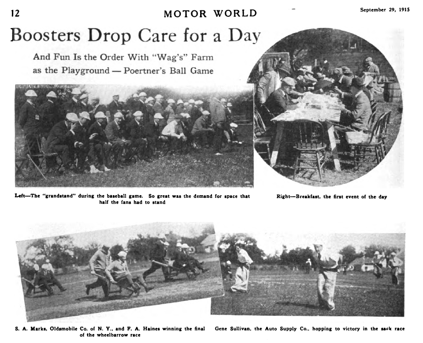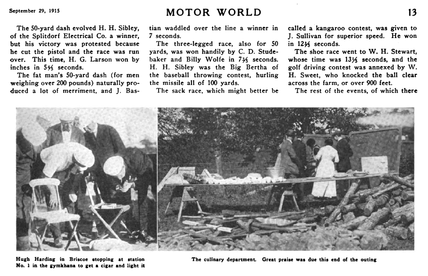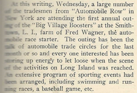 Beginning in 1911, Vanderbilt Cup Race starter, Fred Wagner, hosted an annual party on his Smithtown farm for those associated with the automobile industry. In 1915 over 100 invitations were given out. Food, sports and fun were the name of the game. All documents except as noted courtesy of The Motor World, September 29, 1915.