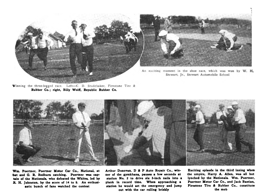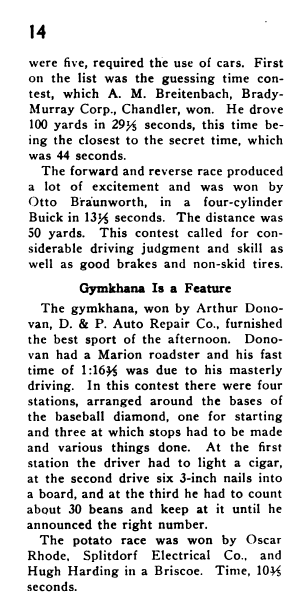 Automobile races included the "guessing time" contest in which participants tried to drive 100 yards in a pre-determined but secret amount of time, the "forward and reverse" race, the "slow speed" contest and a "gymkhana" (driving a car around a baseball diamond and completing various feats).