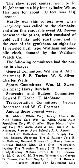 After the days activities a clambake was held and prizes were given out including gold cuff links, gold scarf pins, and a 15 jeweled flush type Walthan automobile clock.