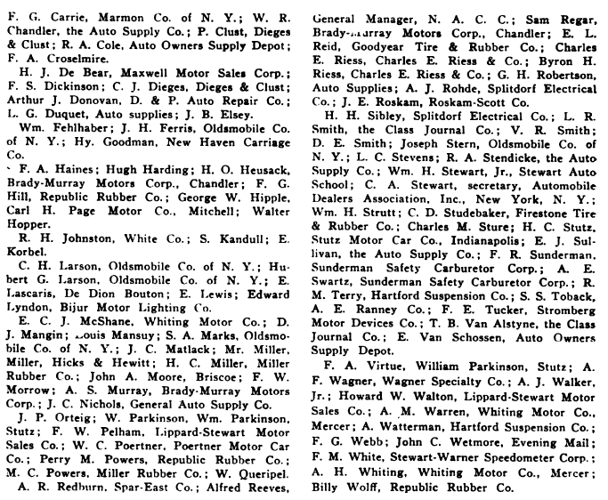 What a blast; thanks muchly, Art! The list of names is fab., but what struck me most was NOT automotive; it was Messrs. P(rosper). Clust and (Col.) C(harles). J(oseph). Dieges! Bet they furnished the cuff links and scarf pins (and maybe the bronze statue); Dieges & Clust was the firm that made all my grade and high school and college (and association) rings and pins! They were famed for medals and plaques. Wonder if they also made car emblems and badges. Sam, III