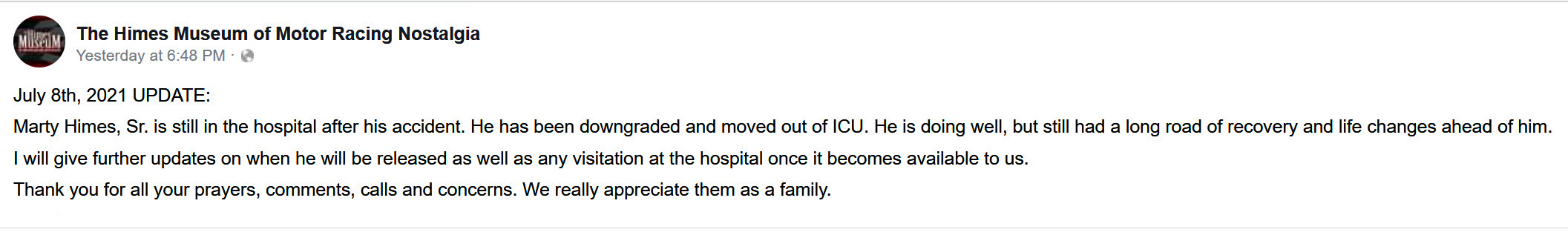 Marty has taken a lot of “dents and dings” in his racing career. There’s no doubt he will recover and come back better than ever. He is truly a friend to the racing community and we are lucky to call him neighbor. Get well soon Marty!