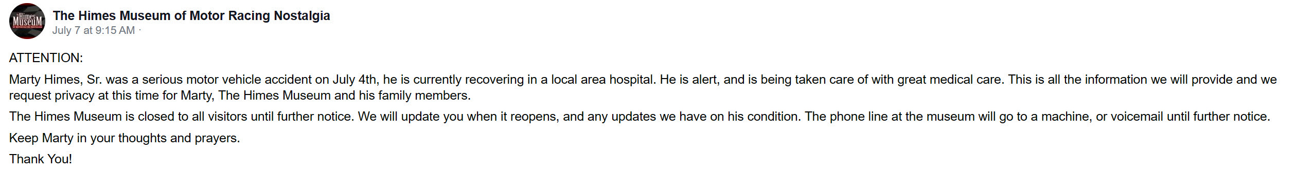At this time we are asking you to give him some time to get back to you or answer phone calls. We are also asking to limit visits to the museum at this time as he is not allowed to do strenuous activity and should be resting from his injuries.... but as we all know... He is Marty Himes, and he does not stop moving, curating and keeping the memory of Long Island Auto Racing Alive.