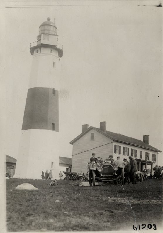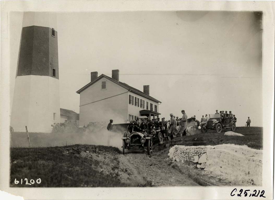 That’s the Montauk Point Lighthouse at the eastern end of Long Island. This was the half-way point of a two day automobile endurance run started in NYC called the 1910 Montauk Point Reliability Run. Sponsored by the Motor Contest Association, it was also known as the Montauk Light Or Bust run. The date of the photo is either June 14 or June 15, 1910, the two days of the event. I think the car in the front is a Mitchell.