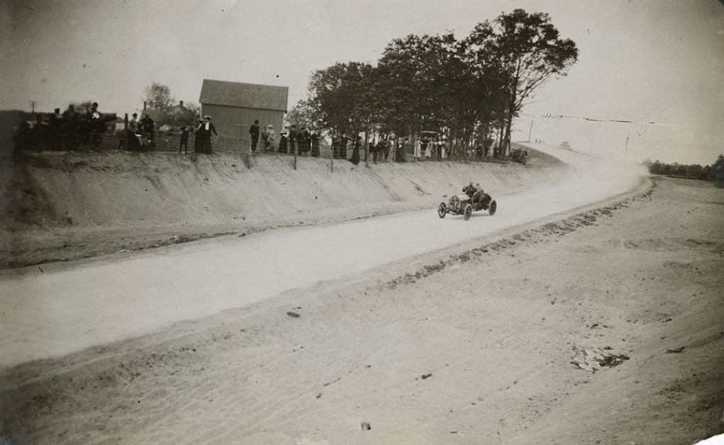 Took me a while to figure this one out but I eventually determined that this location is just before the racers got to the second dead man’s curve. The photographer is facing south and in the distance is the overpass that carried the Motor Parkway over the Long Island Railroad / Central ave crossing in Central Park (Bethpage). This was the Motor Parkway Sweepstakes held on October 10th, 1908. The driver is Herb Lytle driving the Isotta. He finished first in this race. He drove in a total of 6 Vanderbilt related races. More than any other driver.