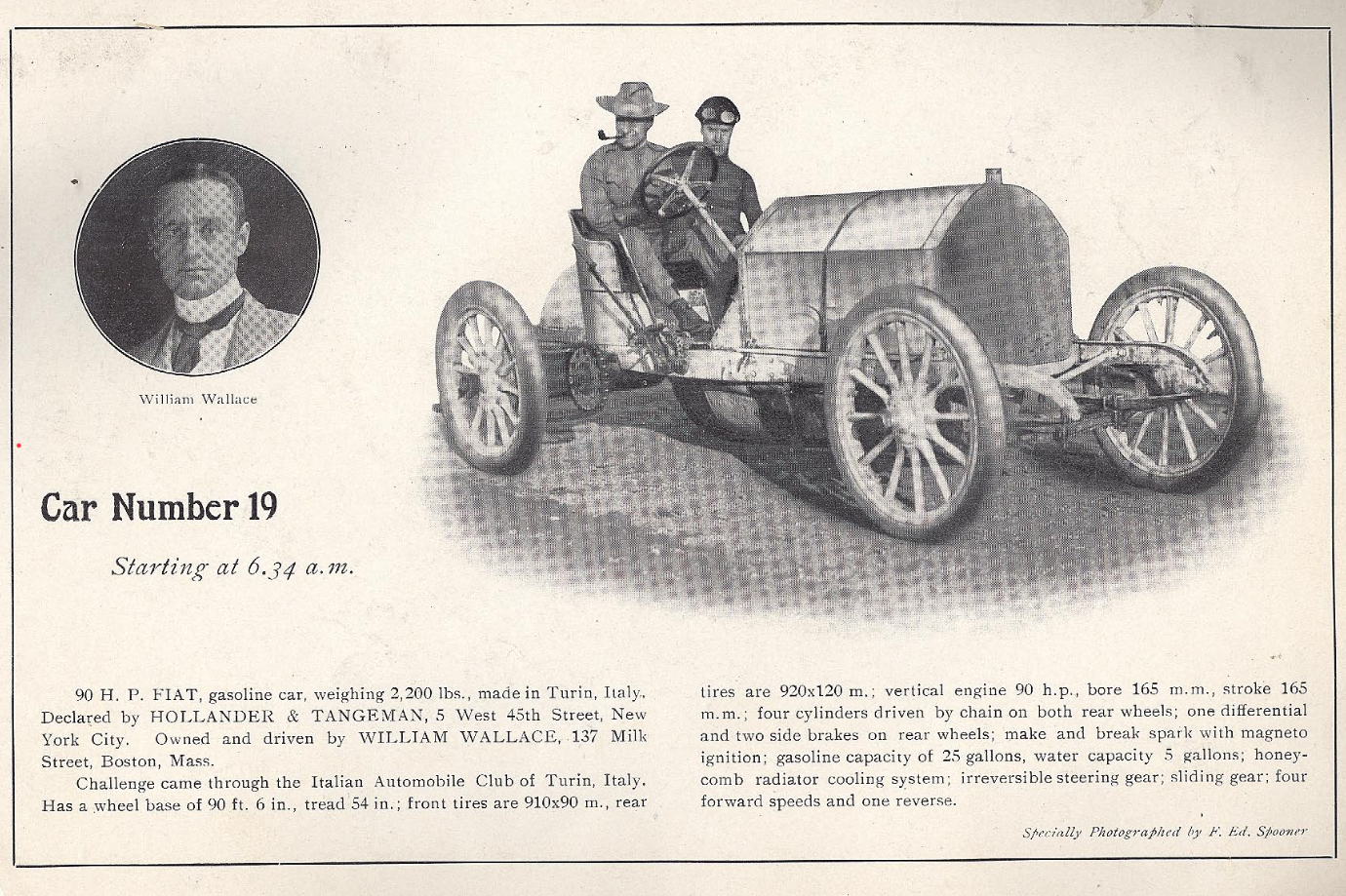 I’m thinking that this “gentleman driver” might be William Wallace. Just surmising that maybe he was called that, and what made him unique was that he was the only Vanderbilt commissioner board member that also drove in a race. The car looks like it could be the 90 hp Fiat. The exhaust headers coming out of the side seem to substantiate this. This car finished last (18th) in the 1904 Vanderbilt Cup Race.