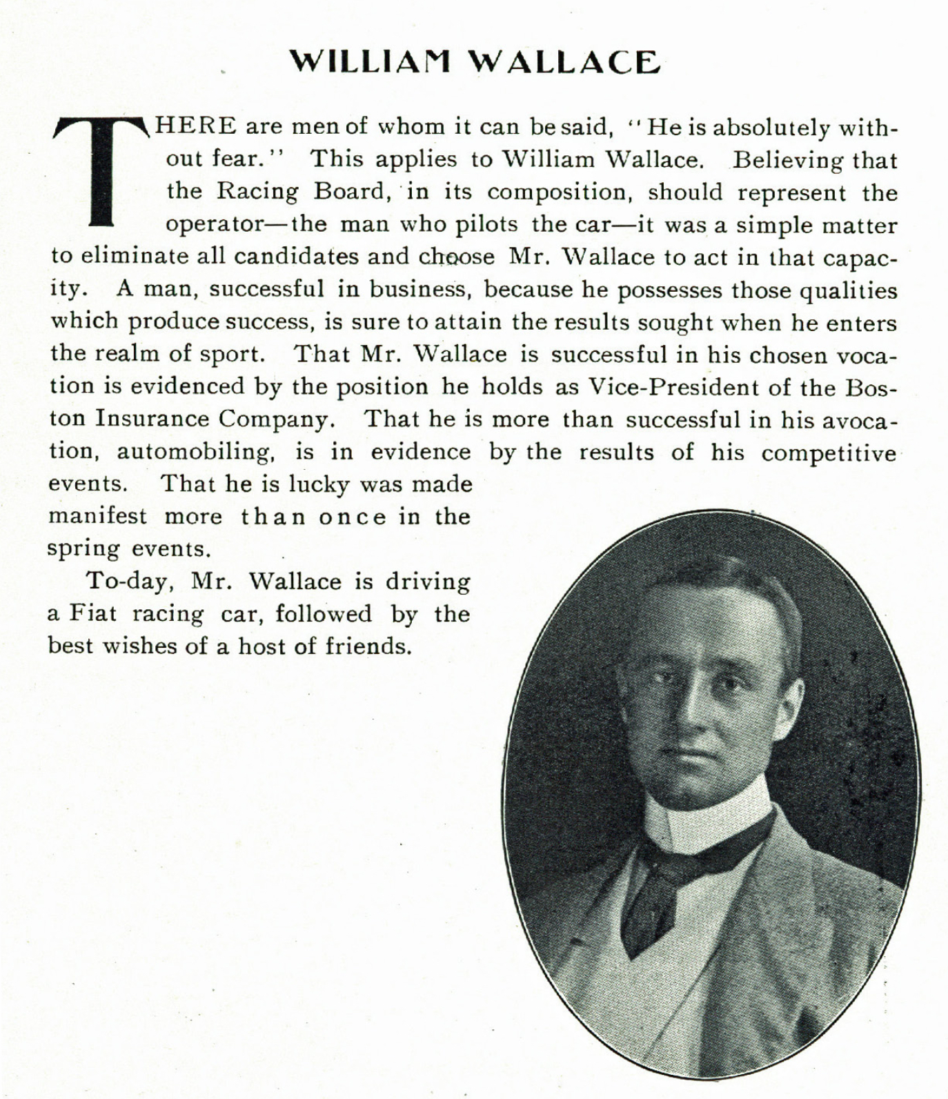 William Wallace, Jr., He was chairman of the Massachusetts Automobile Club race meet committee and a member of the national racing board. Wallace was also a vice-president of the Boston Insurance Company.