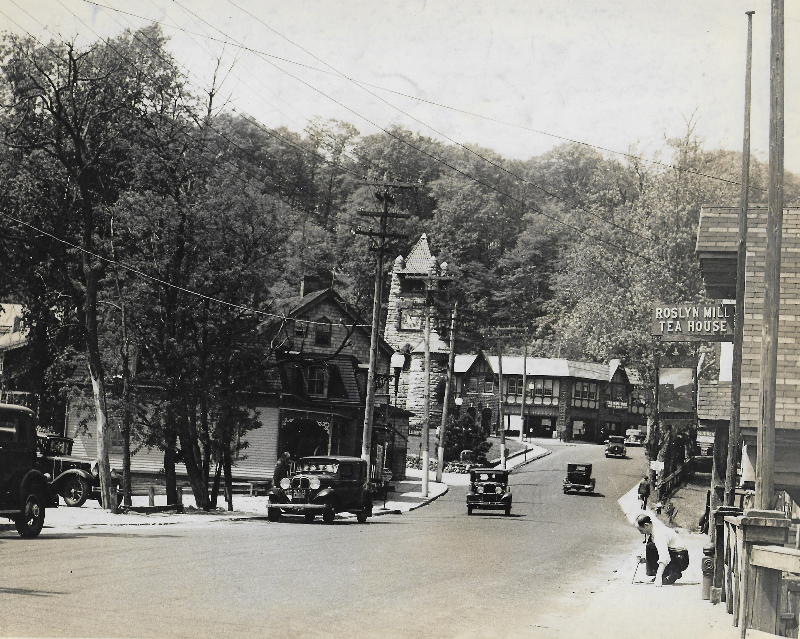 The Village of Roslyn, This is Northern Boulevard [today Old Northern Blvd] looking west towards the clock tower in 1927? The building at the top of the hill was the Lincoln Building at 2 West Main St. Roslyn Motors was located there. The building on the right is the Roslyn Grist Mill where Howard is instrumental in its restoration. I’m not as up on the cars however I’ll leave that to others.