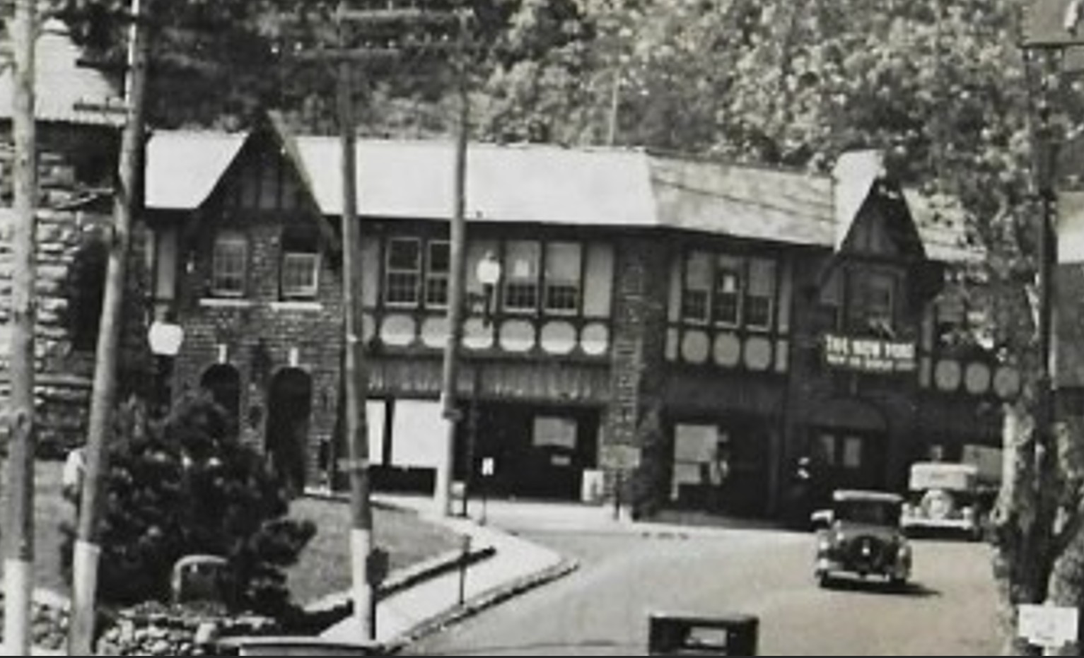 The beautiful Tudor style building is still there and used by several businesses. Apparently it was once an auto dealer as the sign reads “THE NEW FORD.”