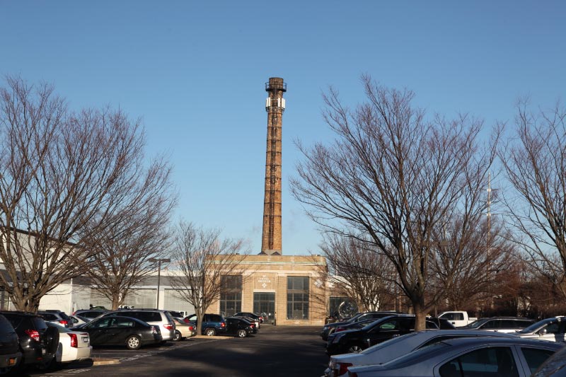 The Curtiss smoke stack from the original 1929 plant has survived with the name "Curtiss" faintly visible, and over the main entrance of the building, the name "Curtiss Engineering Corporation" remains.