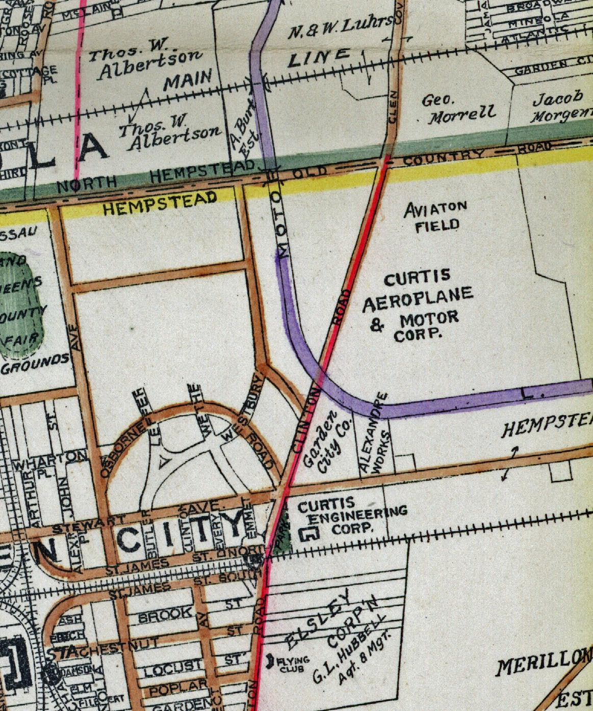 Facing NE along Clinton Rd. in Garden City to Roosevelt Field with the Motor Parkway crossing over Clinton. Curtiss Engineering plant at center right.