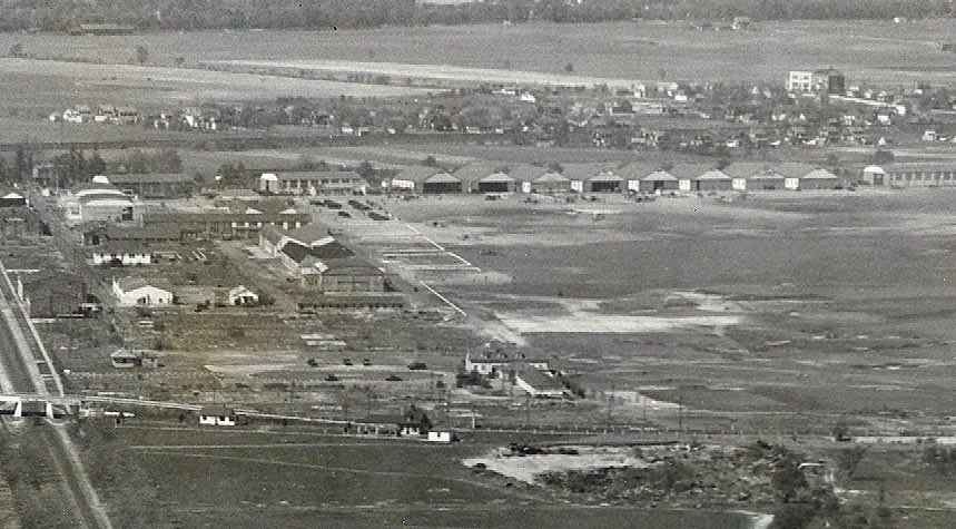 The picture is in Garden City with the Curtiss factory in the front and Roosevelt Field in the background. Yearwise I would place sometime in the late 1930s. The Central Railrod line is the tracks.