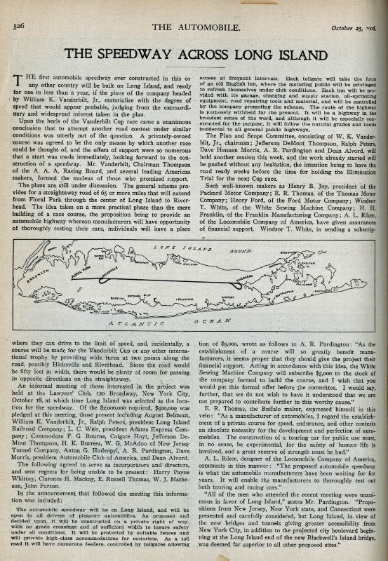 Following a spectator death during the 1906 Vanderbilt Cup Race, the concept for a privately owned speedway on Long Island was developed by William K. Vanderbilt, Jr. and his business associates. As published in the October 25, 1906 issue of "The Automobile", the plan "provides for a straightaway road of 65 or more miles that will extend from Floral Park through the center of Long Island to Riverhead."