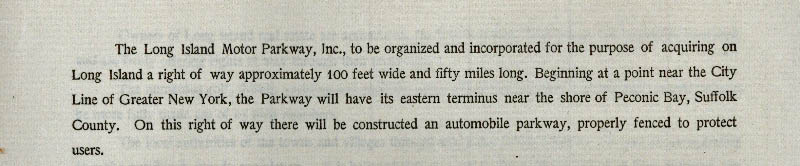The October 1906 Prospectus of the Motor Parkway described the route as "beginning at a point near the City Line of Greater New York, the Parkway will have its eastern terminus near the shore of Peconic Bay, Suffolk County. On this right of way there will be constructed an automobile parkway, properly fenced to protect users."