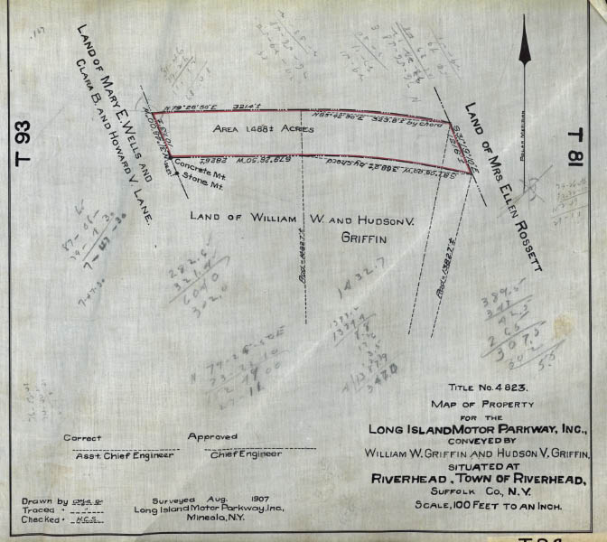 An example of the survey of the Riverhead property purchased by the Motor Parkway, 1.488 acres conveyed by William and Hudson Griffin.
