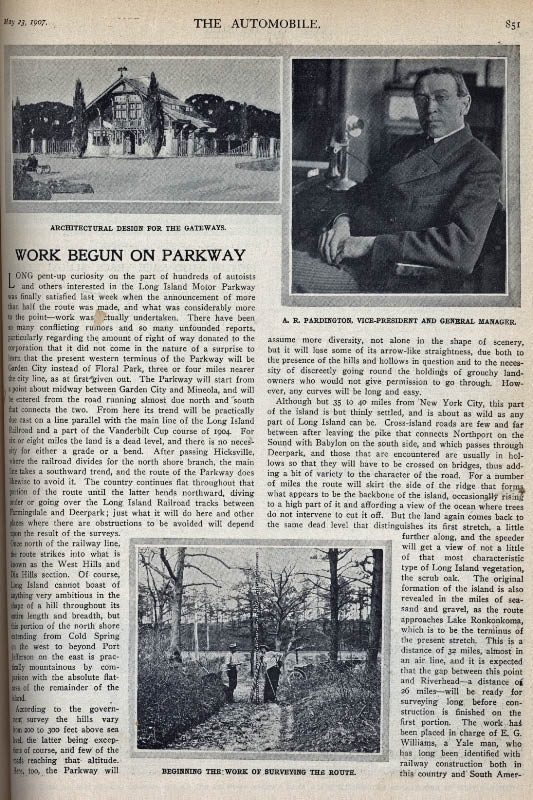 Throughout 1906 and 1907 the Motor Parkway Inc. acquired property in Nassau and Suffolk Counties. As published in "The Automobile" on May 23, 1907 "Work Begun on Parkway" with it starting from "a point about midway between Garden City and Mineola...The route approaches Lake Ronkonkoma which is to be the terminus of the present stretch."