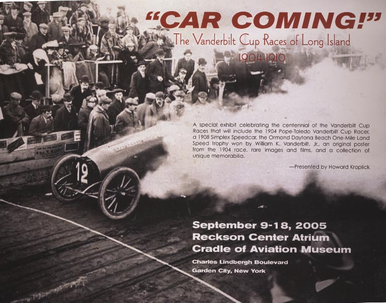 As part of the 2005 Vanderbilt Cup Race Centennial Celebration, I developed an exhibit "Car Coming: The Vanderbilt Cup Races of Long Island" at the Cradle of Aviation in East Garden City