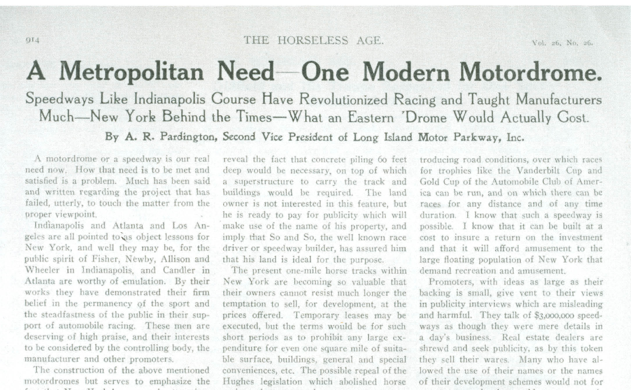 Following two fatalities and several spectator injuries during the 1910 Vanderbilt Cup Race, it became clear that six years of racing, the sport had outgrown the venue of racing on Long Island roads. However, Motor Parkway officials refused to call it quits. In the December 28, 1910 issue of Horseless Age and the January 1, 1911 issue of The New York Times, A.R. Pardington, Second Vice President of the Parkway, authored an article calling for a "modern motordrome... a speedway like the Indianapolis course". Pardington stated:
