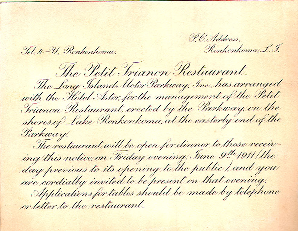 When the Long Island Motor Parkway route was completed to Lake Ronkonkoma in 1911, officials decided to build a first-class dining facility and half-way stop for travelers.William K. Vanderbilt Jr. once again commissioned architect John Russell Pope to design the Parkway Inn later renamed Petit Trianon.These two rare photos show the Petit Trianon under construction in early 1911.