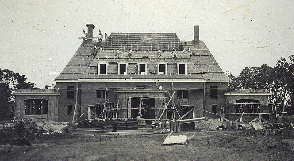 In this photo, workers can be seen finishing the roof.The interior of the inn featured a large reception room suitable for weddings, balls and special events. Accomodations for spending a night or a weekend were available in the 30 bedrooms on the second floor.