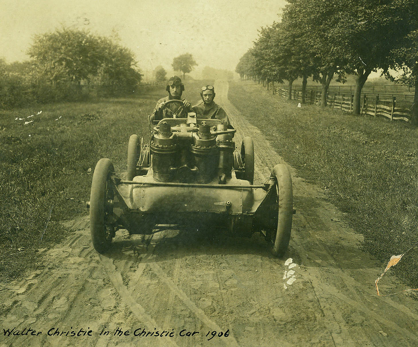 Walter Christie in the front-wheel drive Christie on Glen Cove Road in Old Westbury preparing for the 1906 Vanderbilt Cup Race. In this view looking north, there is not another car on the road.