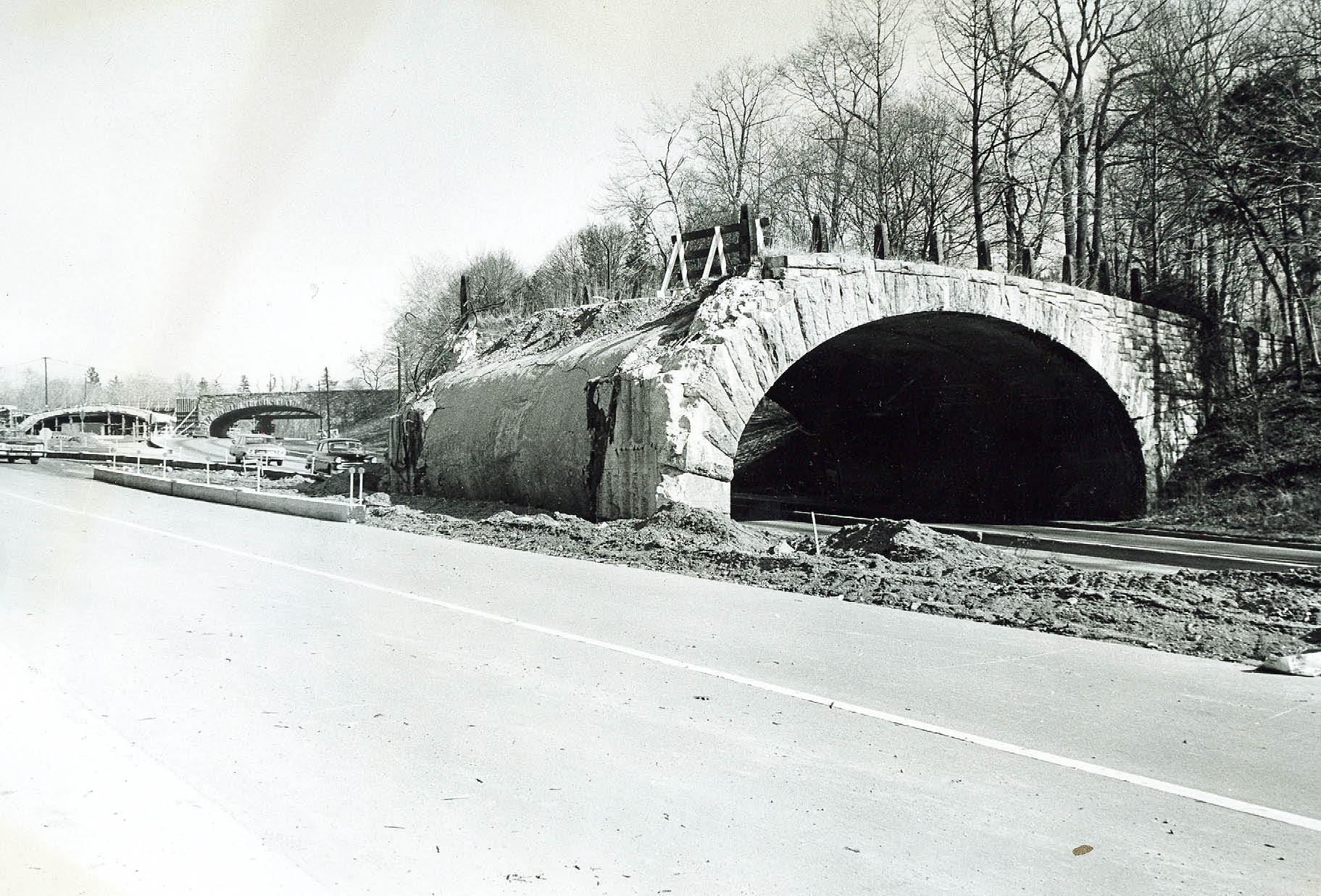 Looking west, the Motor Parkway Bridge over the Northern State Parkway near New Hyde Parkway being dismantled in 1968. Lakeville Road can be seen in the background. This Motor Parkway Bridge was one of two bridges to cross the newly-built Northern State Parkway as commissioned by Robert Moses in the early 1930s.