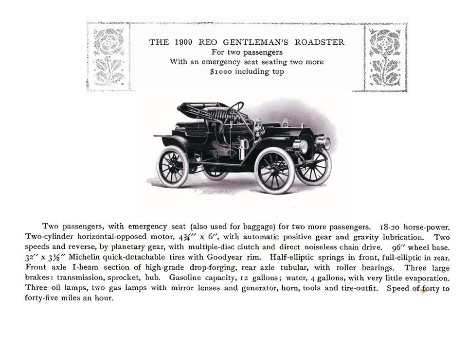 A similar modified Reo Roadster participated in the Nassau Sweepstakes Race held on the opening day of the Motor Parkway on October 10, 1908.