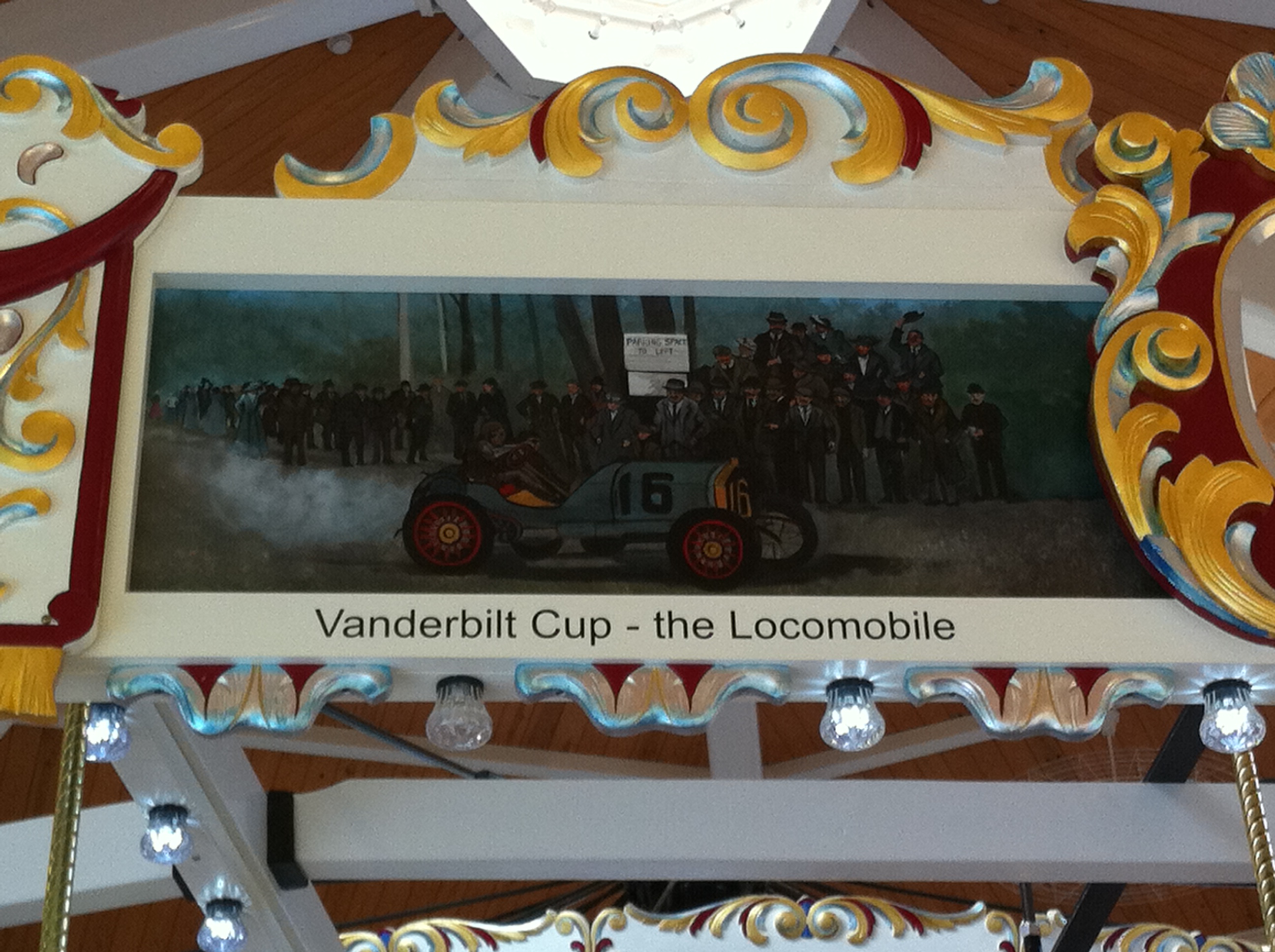 For several generations of children on Long Island, a fond memory was riding Nunley's Carousel on Sunrise Highway in Baldwin. Closed in 1995, Nunley's Carousel was restored and relocated to the Cradle of Aviation in East Garden City in 2009. While attending a Thursday cruise night at the museum, Bruce Latten checked out the carousel and noticed a link to the Vanderbilt Cup Races.Click on the photos to enlarge them.