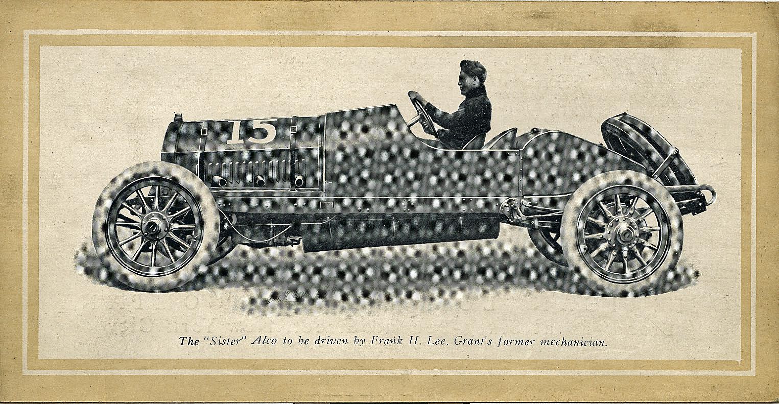 "Frank H. Lee, Grant's mechanician, will drive a second car, and Harry Hartman, the well-known racing driver, will drive the third. The new cars are being tried out daily to determine their speed and to test every part. No definite date has been set for the first public appearance of the team, but it is likely they will be entered in the Elgin race, in August. The Alco team will enter road races, track races and hill climbs in all sections of the country."