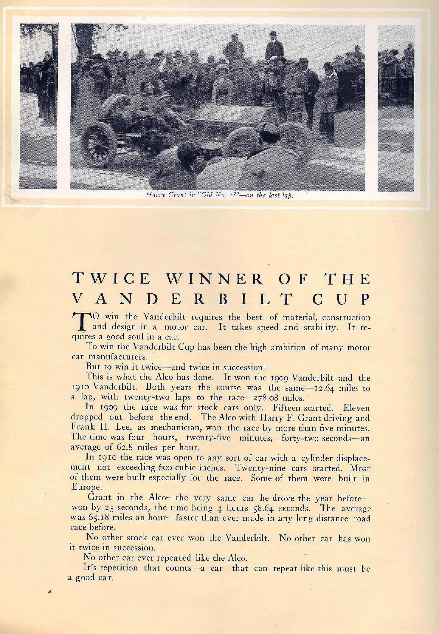 The brochure noted; "Harry F. Grant will continue to drive the car in which he won Vanderbilt Cup twice....No other car ever repeated like the Alco. It's repetition that counts-a car that can repeat like this must be a good car."