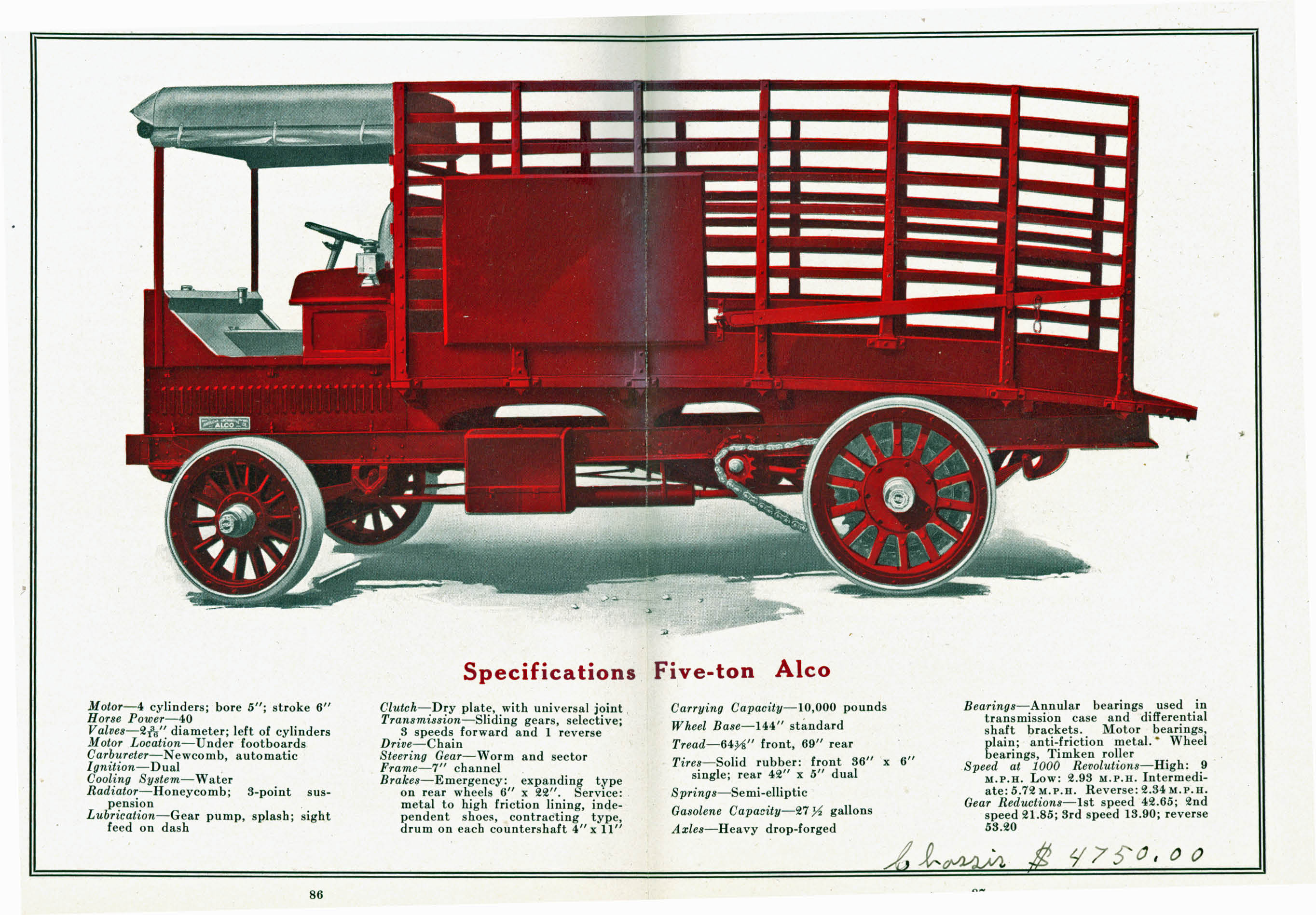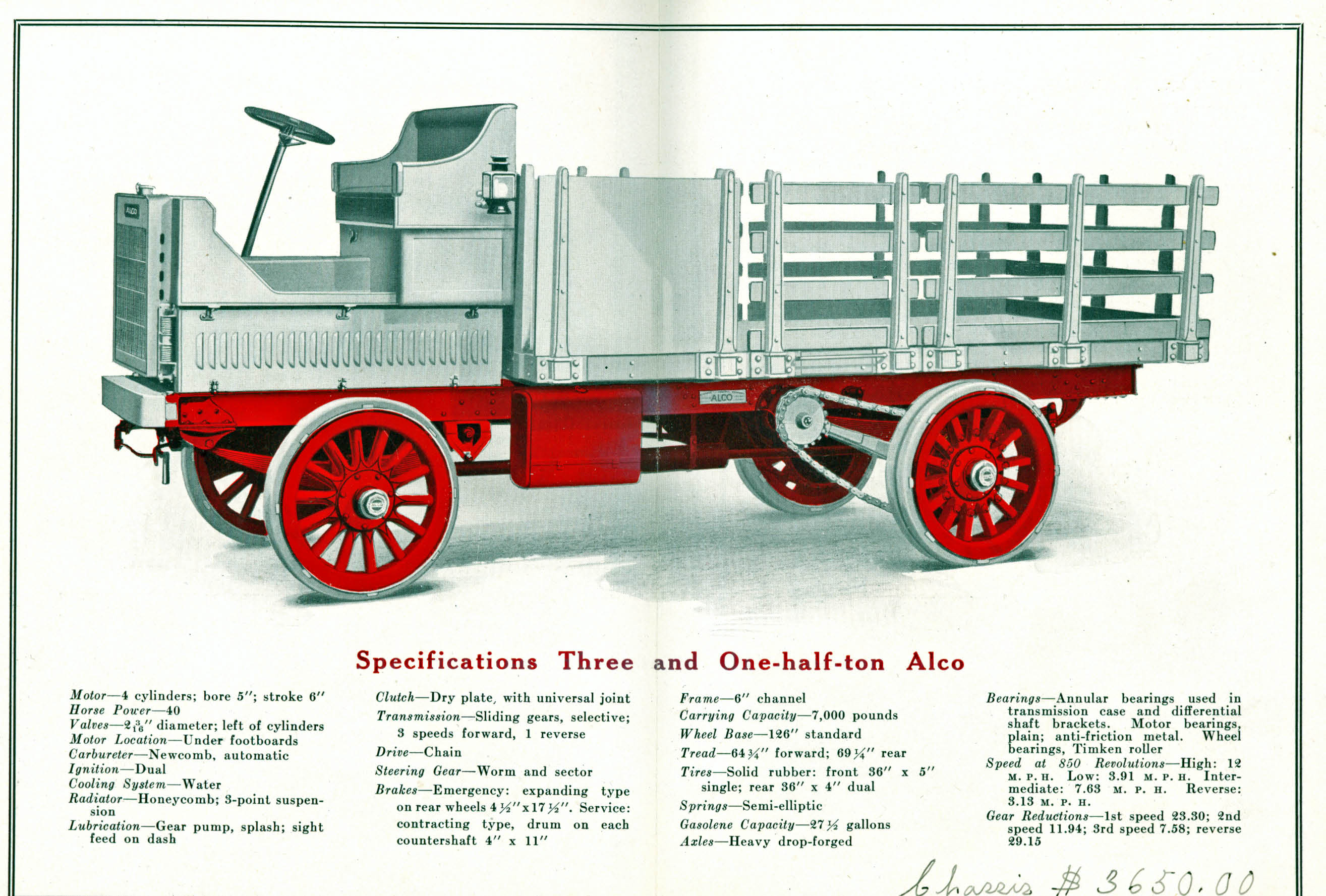 In addition to automobiles, the American Locomotive Company manufactured over 1,000 Alco trucks from 1909 to 1913. A cab-over-the engine design was universal on the Alco trucks, ranging from 2 to 6 tons. Maximum speed ranged from 8 mph for the heaviest Alco to 17 mph for the 2-ton Alco. Customers included Singer Sewing Machine Company, Gimbels, and Henry Kroger.