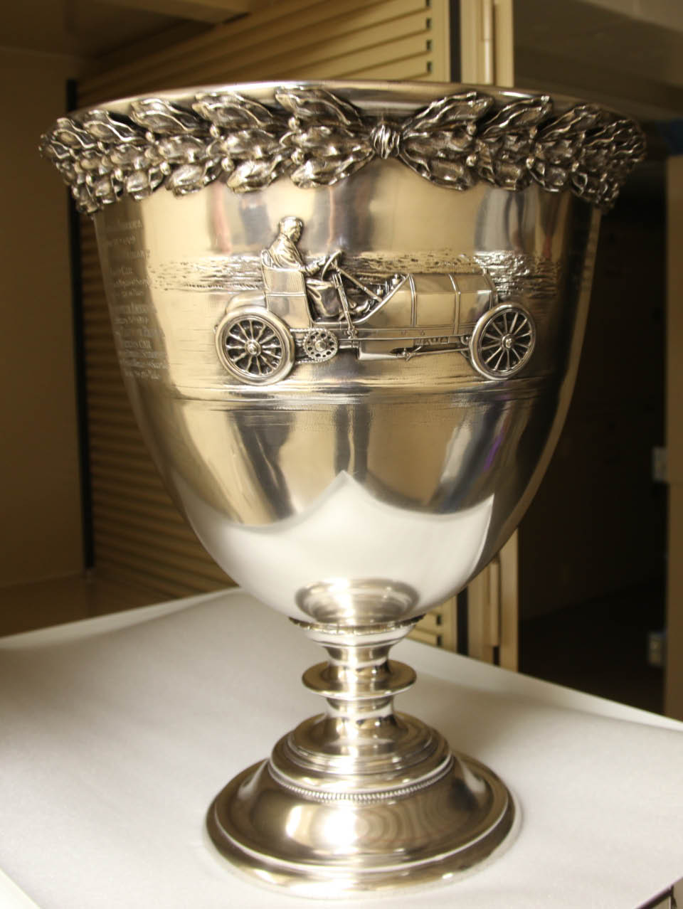 A fine portrait of William K. Vanderbilt Jr. in his 90 horsepower Mercedes at Ormond Beach is worked up in bold relief on the front of the Cup. It celebrates Willie K's greatest personal racing accomplishment of breaking the one-mile land speed record on January 27, 1904 going 92.3 mph.
