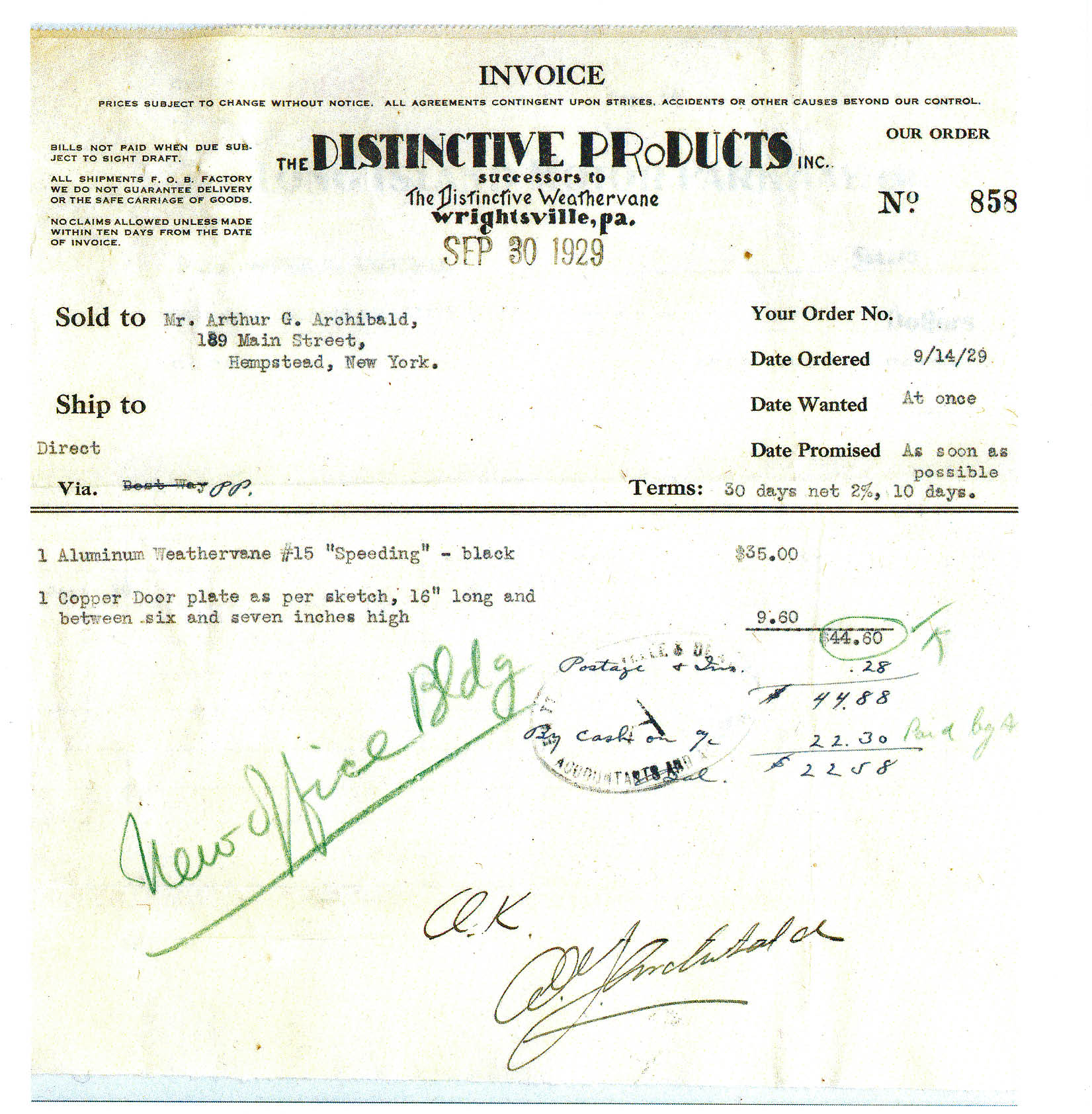 Amazingly, Al Velocci found the September 1929 invoice for the weathervane in the archives of the Suffolk County Vanderbilt Museum. The aluminum "Speeding" weathervane #15 was made by The Distinctive Products of Wrightswille, Pennsylvania and cost $35. The weathervane was sold to Arthur G. Archibald, the parkway's engineer from 1927 to 1938, marked for the "New Office Bldg" and "Paid by A".