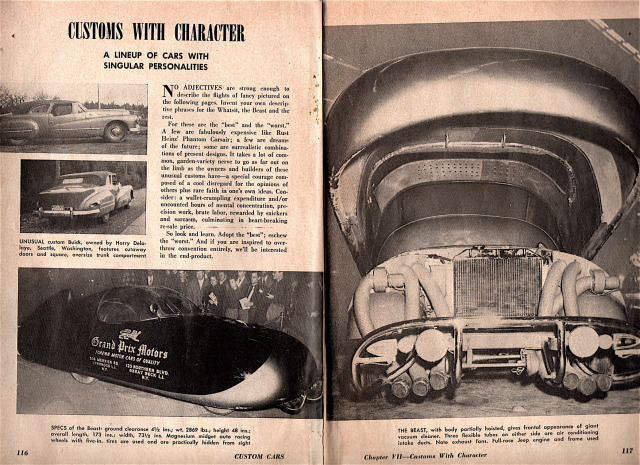 50Fraud of the H.A.M.B. board (focused on hot rods and customs) discovered two other views of the car in a 1951 Motor Trend article on custom cars. The car was called the "Beast", weighed 2,669 pounds and had a Jeep engine.